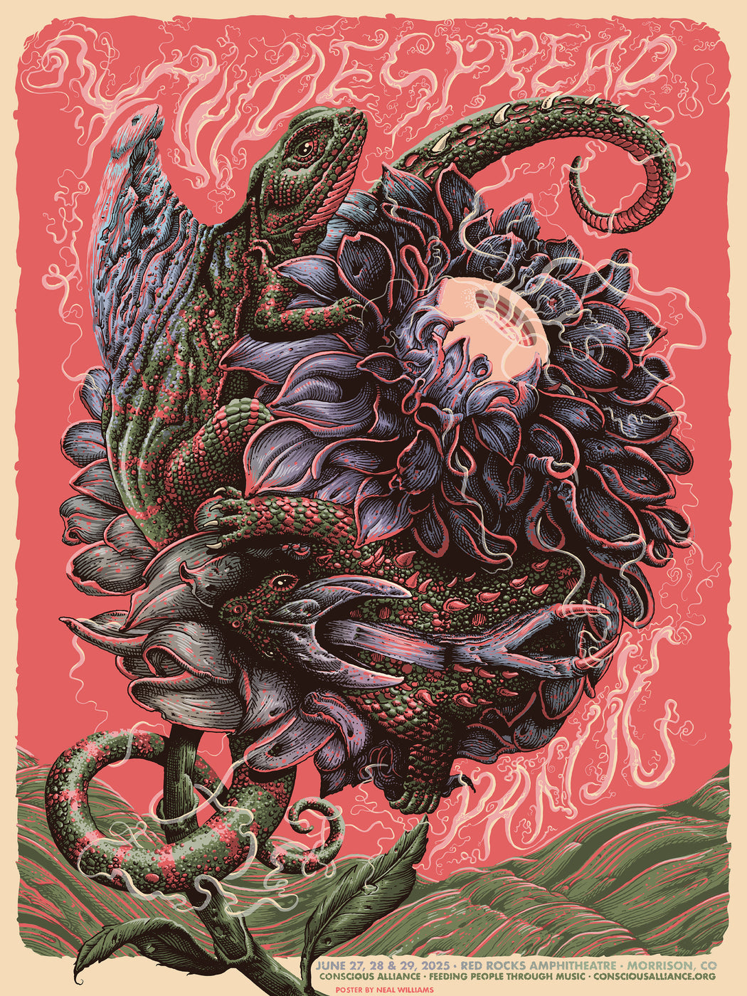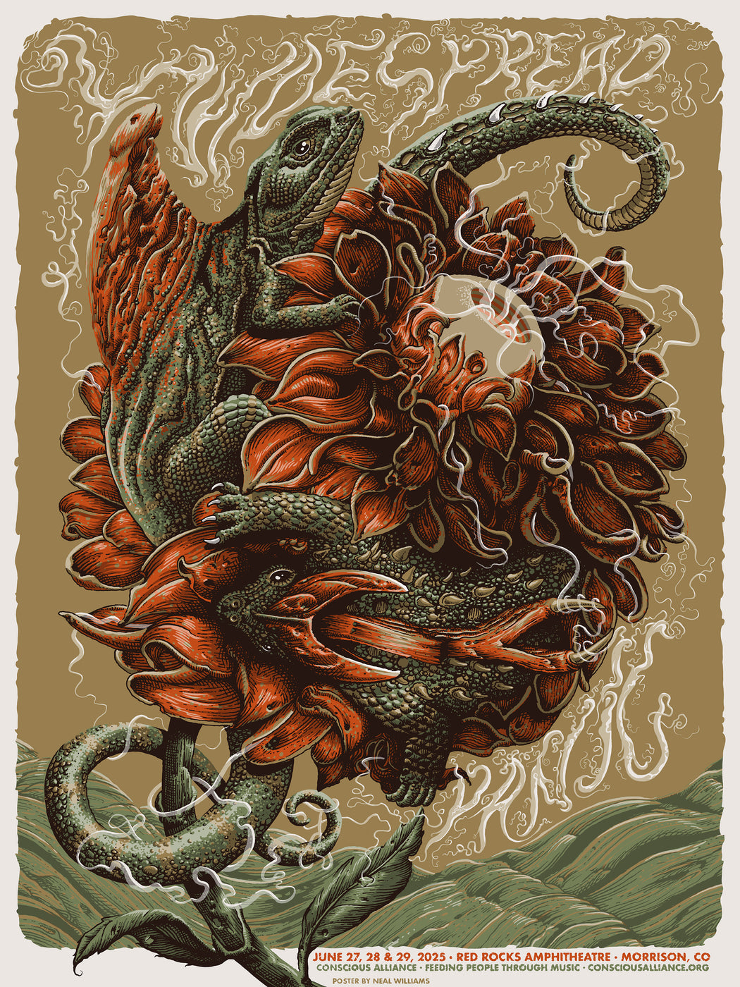Bring your donations to one of our booths located in the Trading Post and Upper North lots. Conscious Alliance volunteers will be there to accept your non-perishable food donations starting 1 hour before doors open. We will also have a tent inside at the top of the venue where you can make a suggested cash donation for the poster.